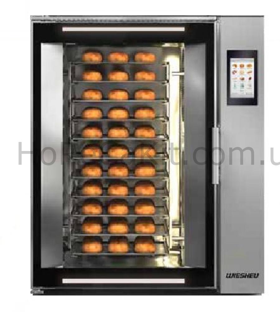 - Печь поддерживает установку 9, 11 или 12 противней формата 600×400 мм, обеспечивая гибкость загрузки в зависимости от объёма производства. Это делает Wiesheu E3L ProClean универсальным решением как для крупных производств, так и для торговых точек с постоянным потоком клиентов.